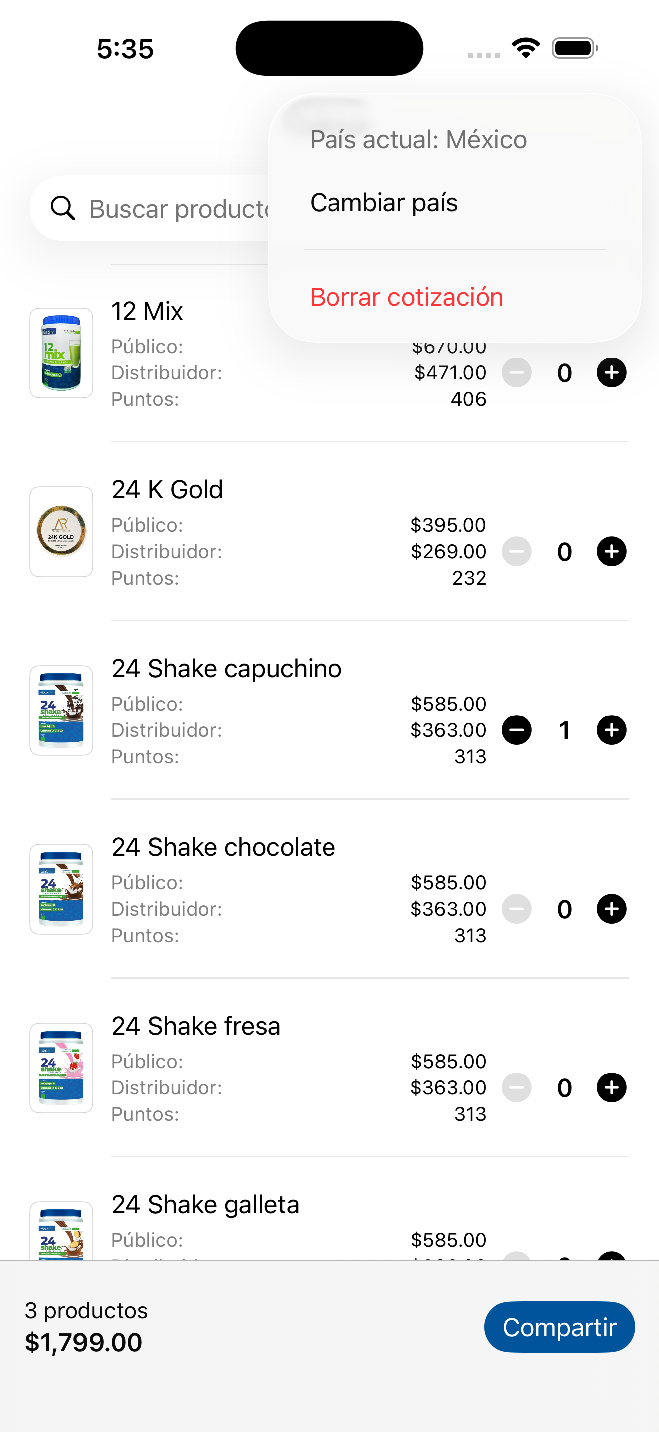 Cambia de país fácilmente y consulta precios en diferentes mercados.