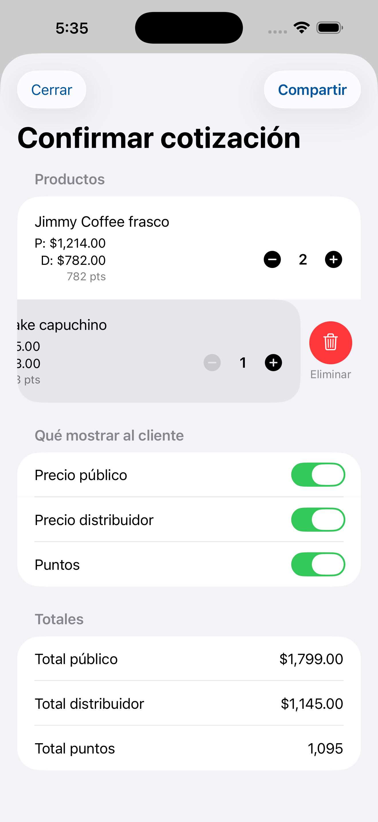 Selecciona productos, ajusta cantidades y comparte cotizaciones claras con tus clientes.