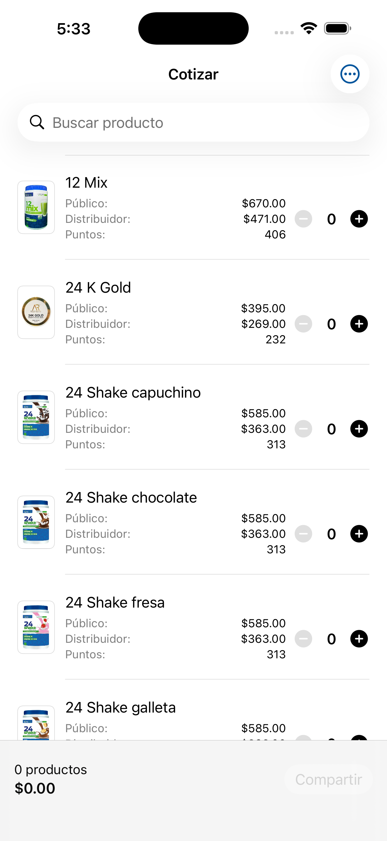 Accede a la lista de productos con precios actualizados para público y distribuidor.